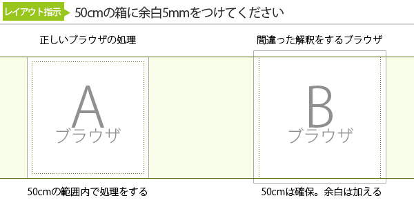 例えば「高さ、横幅各50cmの箱の中に、5ミリずつ上下左右に隙間を開ける」という命令をブラウザに出したとして、あるブラウザは「左右で1cm、上下で1cm余白を作るから物を入れられるのは49cm、全体の高さ、横幅は50cm」という結果を出し、あるブラウザは、「50cmは確定だから、上下左右共に5mmずつ広げよう。物を入れられるのは高さ、横幅50cm、箱全体の大きさは高さ、横幅51cm」という結果を出します。(実際には「cm」や「mm」といった単位はホームページではほとんど使いません。便宜上このような表現とさせていただいております)